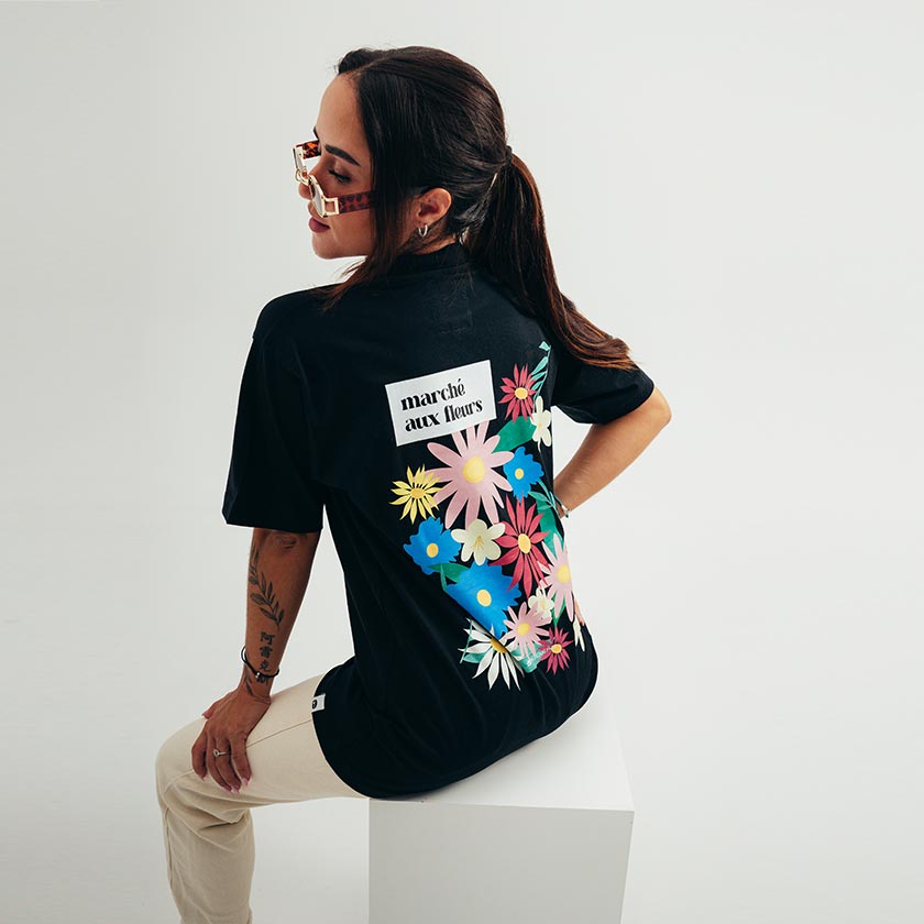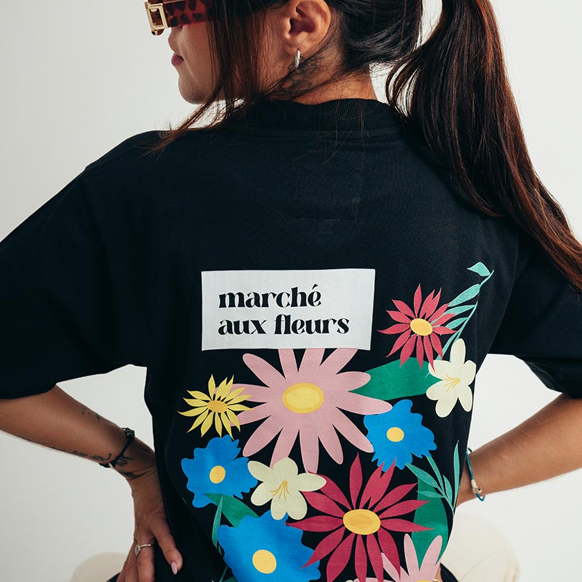 Ce t-shirt Marché aux Fleurs est un incontournable ! En coloris noir, nous avons eu l'envie de jouer avec des couleurs vives et des couleurs pastels dans un esprit street chill.